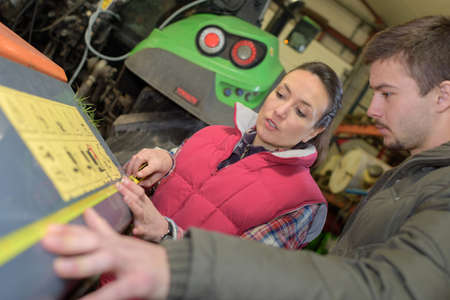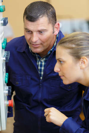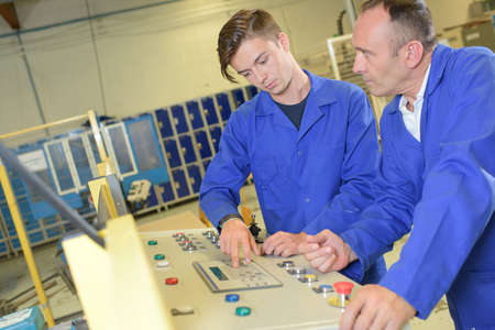 engineer checking control panel and teaching new Automatics robot arm and operating control machine in factory.