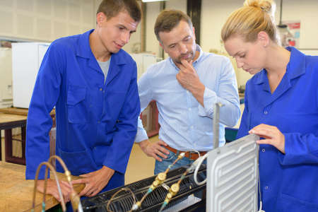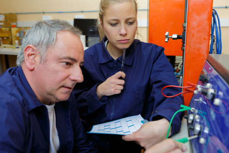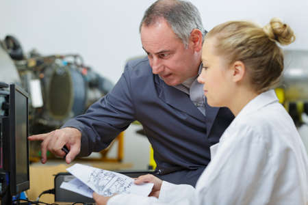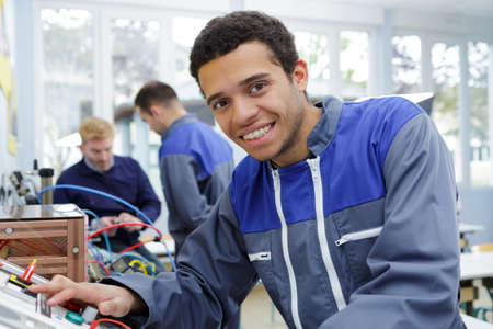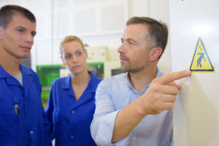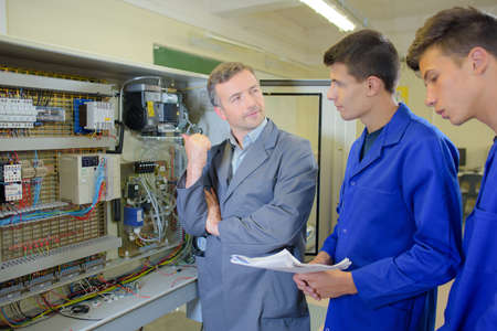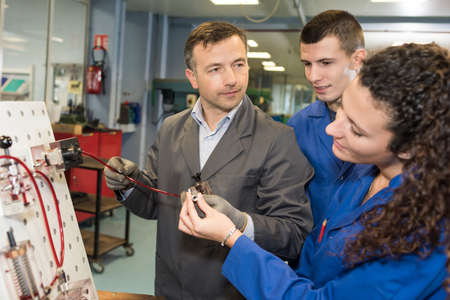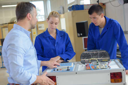 The robotic hand technology teacher is instructing new students on how to use electronic circuit boards and robotic hand commands for a variety of industrial applications.