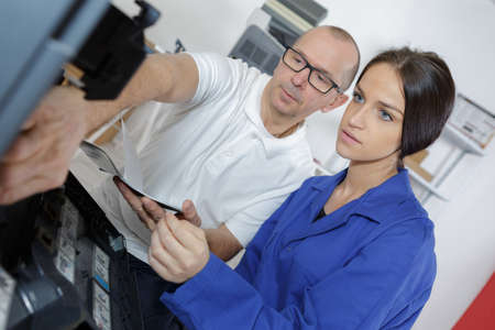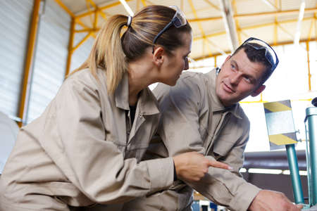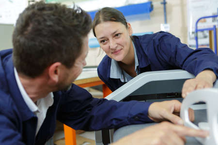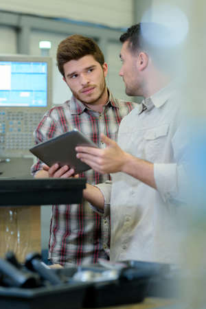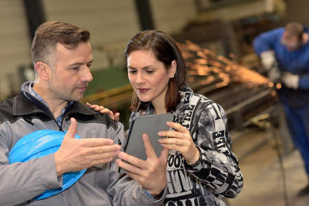 Happy workers using a tablet are sharing their positive ideas in the factory