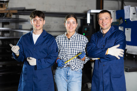 Portrait of two positive workers and girl student in the metalworking workshop of metallurgical plant