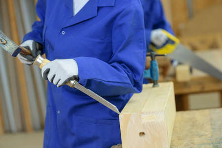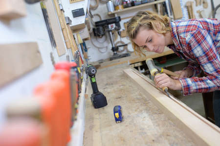 woman using hammer and chisel to cut groove from wood