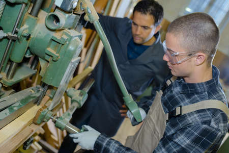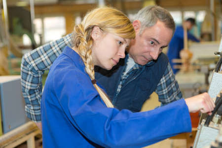 apprentice worker learning on factory machine