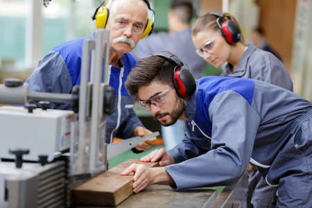 Male apprentice is learning woodworking techniques from older man in a busy workshop