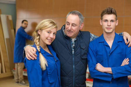 carpenter with apprentices in workshop