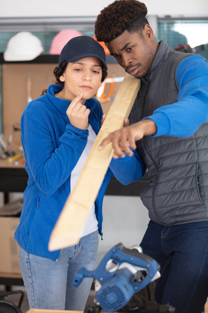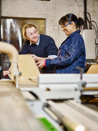 man and woman workers in carpentry workshop