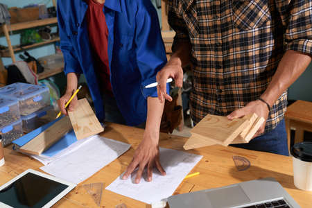 Warm toned portrait of two carpenters designing handcrafted furniture piece in workshop