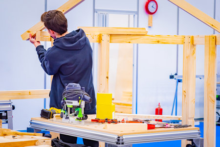 Man collects a house frame from a tree. Workshop on the collection of houses. Assembly of wire-frame buildings in a factory. Man is assembling a building. carpenter. Joinery equipment on the table
