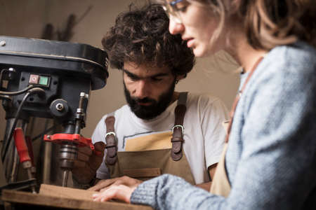 A young couple of carpenter working together in a small wood laboratory using a drill machine for timber. Couple crafting new home furniture in a carpentry workshop. young entrepreneurs concept