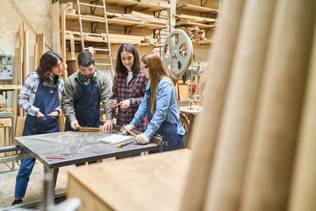 A group of young apprentices work together with their mentor in a lumberyard. They are gathered around a workbench, learning woodworking skills in a collaborative and friendly environment.