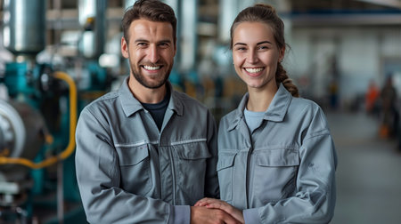 Two young intercultural colleagues in uniform and hardhats looking at you while standing in front of camera in spacious workshop