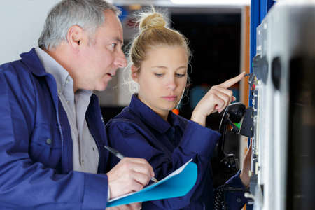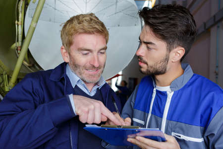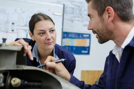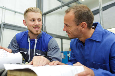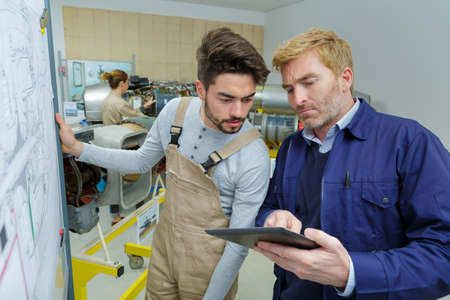 engineer giving guidance to apprentice in factory