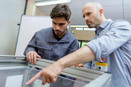 two careful workmen work at pvc windows factory
