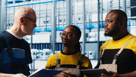 Photovoltaics smart factory senior engineer taking notes of adjustments needed, talking with coworkers. Industry 4.0 solar panels plant team leader modifying production plans, camera A