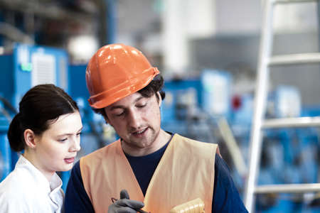 A young leader of the conveyor belt discusses work processes with a female worker