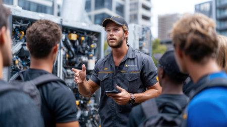 Female instructor guiding a group of young apprentices in a training facility, emphasizing teamwork and skill development in an industrial setting