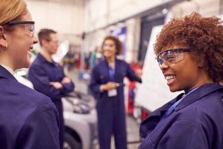 Female Tutor By Whiteboard With Students Teaching Auto Mechanic Apprenticeship At College