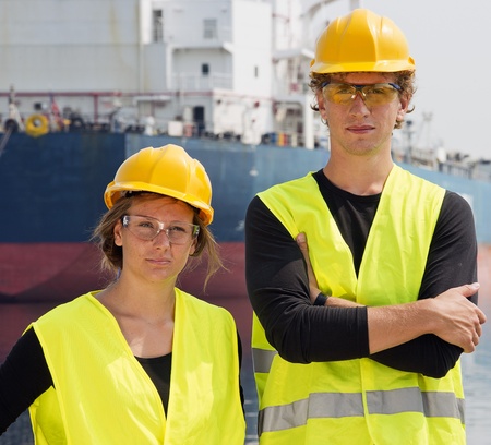 Two Engineering students posing in front of a huge freight vessel during their technological internship in a harbor
