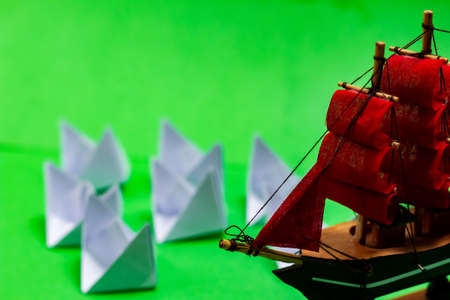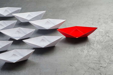 Business Concept, Paper Boat, the key opinion Leader, the concept of influence. One red paper boat as the Leader, leading in the direction of the white ships on a gray concrete background