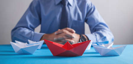 Businessman in office. Red origami paper boat with a white boats. Business, Leadership