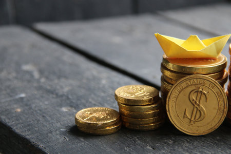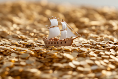 Sailing ship navigating a sea of glittering golden coins