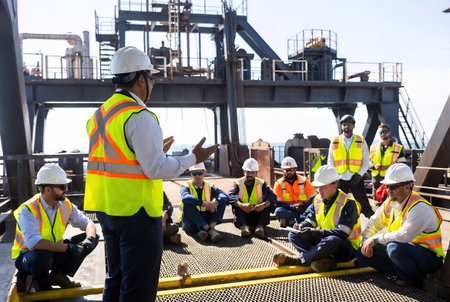 Shipyard workers in bright orange hard hats stand together at an industrial harbor, discussing their tasks while giant cargo ships loom in the background.