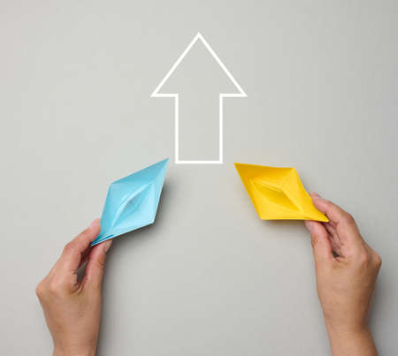 Paper made origami boats placed on an office desk in an arrow shaped position in a conceptual image.
