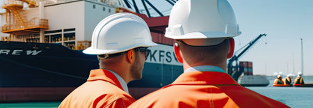 Shipyard workers discuss their tasks while gazing at distant cargo ships in a bustling industrial port, reflecting teamwork in action.