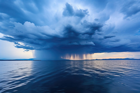 An image captures a coastal scene dominated by a vast, imposing display of dark storm clouds. Heavy rainfall descends towards the ocean surface, creating a stark contrast against the calm water. The composition highlights the raw power of nature, suitable for commercial or editorial applications.