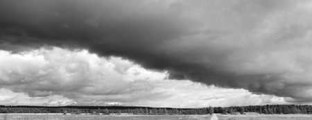 Dramatic stormy sky over the lake and forest. Panorama.