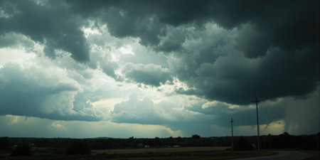 Dramatic storm clouds looming over empty rural road in vast landscape.