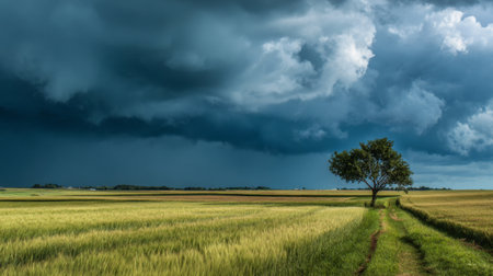 A stunning landscape featuring a solitary tree standing tall in a golden field under a dramatic sky filled with dark storm clouds, capturing the beauty of nature.