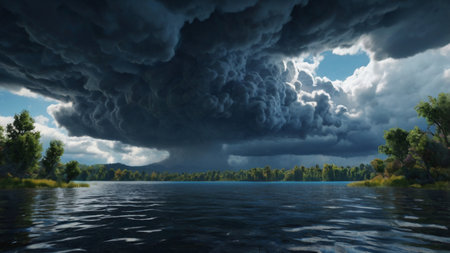 Storm clouds swirling over a large lake, reflecting the dark sky generative ai