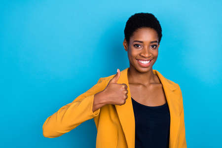Photo of young girl guy show finger thumb-up approve recommend select feedback isolated over blue color background