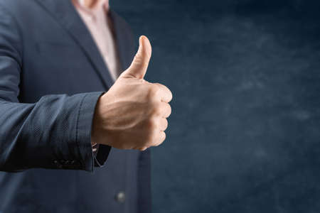 Businessman showing thumbs up - closeup shot. Business man showing thumb up. Person giving the thumbs up over blue background. Business thumbs up concept