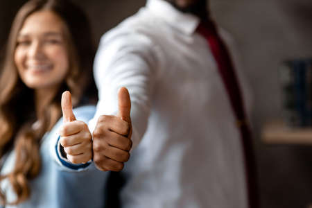 Business concept.Smiling girl shows class and rejoices with work partner. Close-up portrait of hands. high quality photo
