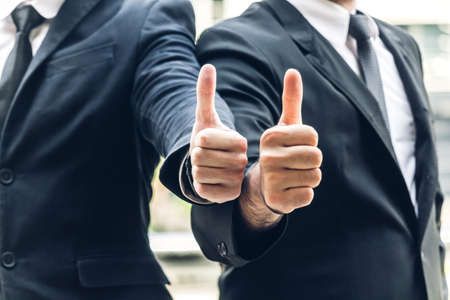 Two smiling businessman coworkers in black suit showing thumb up in the modern city. teamwork and Partnership concept