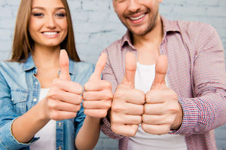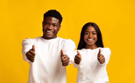 Happy young lovely couple showing thumbs up and looking at the camera over yellow background