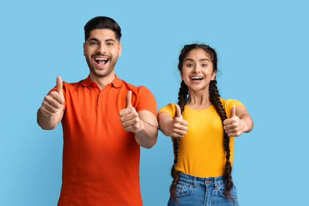 Great Choice. Positive young middle eastern couple gesturing thumbs up at camera