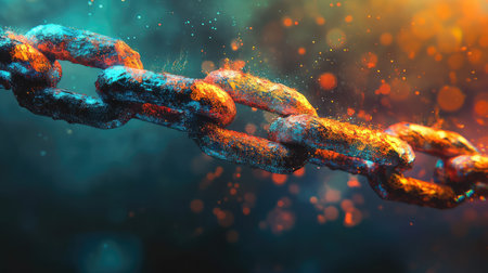 Detailed examination of a fractured chain link, showing its metallic tones and representing weakness and disconnection in structures.