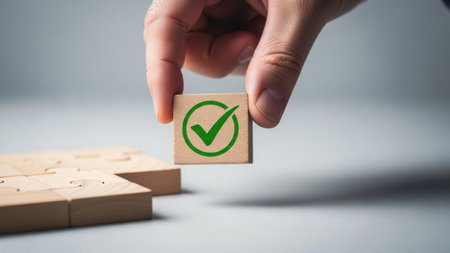 The image features a hand holding a wooden cube with a green check mark on it. The cube is the central focus, isolated on a white background. The background is transparent, making it suitable for various digital applications.