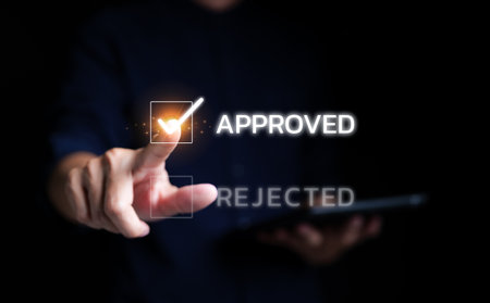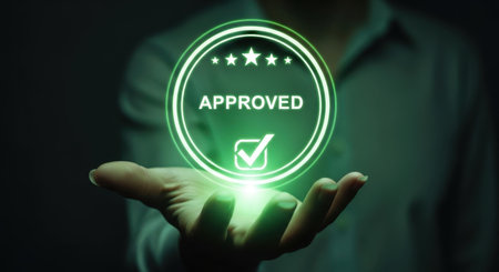 Human hand holding a glowing green digital emblem displaying APPROVED text, four stars, and a checkmark, symbolizing quality assurance and success.