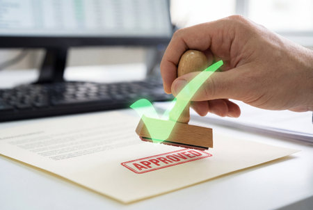 A male hand holds a wooden rubber stamp and presses it onto a paper document to leave a red approved mark while a digital green check mark glows brightly above the stamping action.