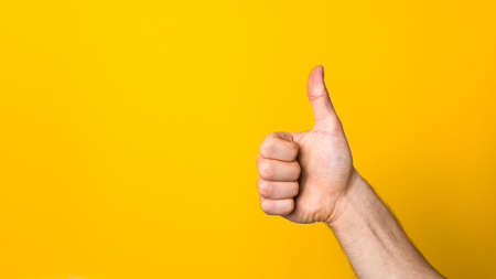 woman's hand with thumbs up gesture in copy space area for advertisement promotion or text on yellow background