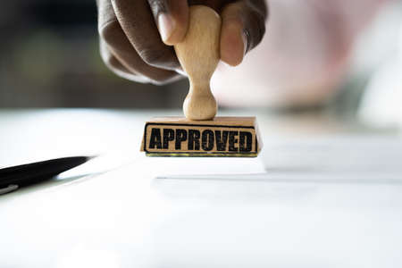 Close-up Of A Person's Hand Stamping With Approved Stamp On Text Approved Document At Desk, Contract Form Paper