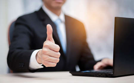 Businessman showing thumbs up and working on laptop computer in home office, business and education, new market in 2021 concept