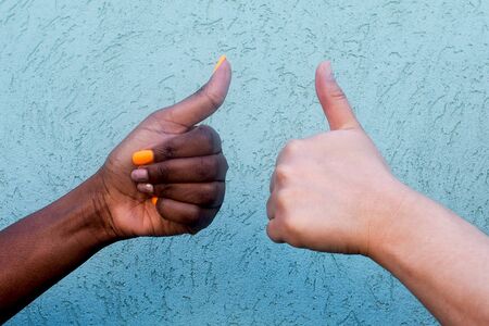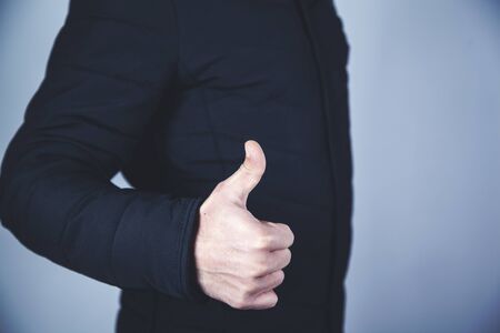 Thumb male right hand on a dark background with place for text. Like, approval, classy, compliment male left hand on a white background with place for text. How, approval, cool, compliment