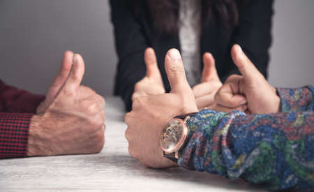 Close-up showing thumb-up expressing positive estimation.Approval concept
