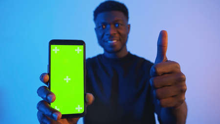 Man holding smartphone with green screen at camera - Showing thumbs-up . High quality photo