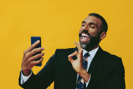 portrait of smiling positive handsome bearded gentleman in suit and tie with smartphone video call ok sign hand on yellow background