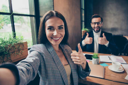 Close up of funny business man in suit shirt tie posing isolated on grey background. Achievement career wealth business concept. Mock up copy space. Doing selfie shot on mobile phone showing thumb up.